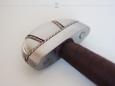 Le pommeau a été serti de torsades de fils cuivre et argent pour rappeler la richesse des décorations de l'affutée.