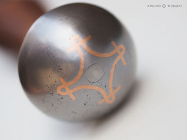 Des symboles sont gravés à la main sur la garde et le pommeau puis damasquinés au fil de cuivre.